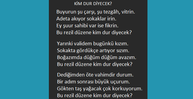 Çöküyor Milletin en kök temeli,Bu rezil düzene kim dur diyecek?Allah için biri bir şey demeli,Bu rezil düzene kim dur diyecek? Müslüman çocuğu, Müslüman yurdu,Soydu örtüsünü attı savurdu.Utanma duygusu diplere vurdu.Bu rezil düzene kim dur diyecek? Açıl, açıl, açıl nereye kadar?İnsan bu kadar mı özünden sapar.Gemi su alıyor, susarsak batar.Bu rezil …